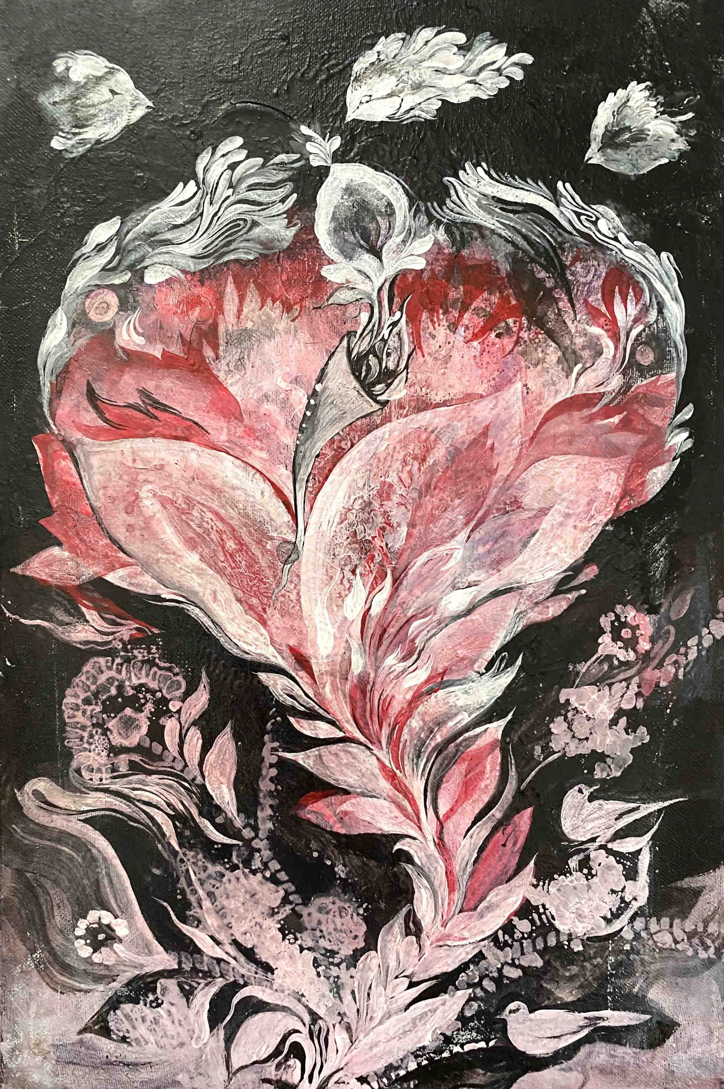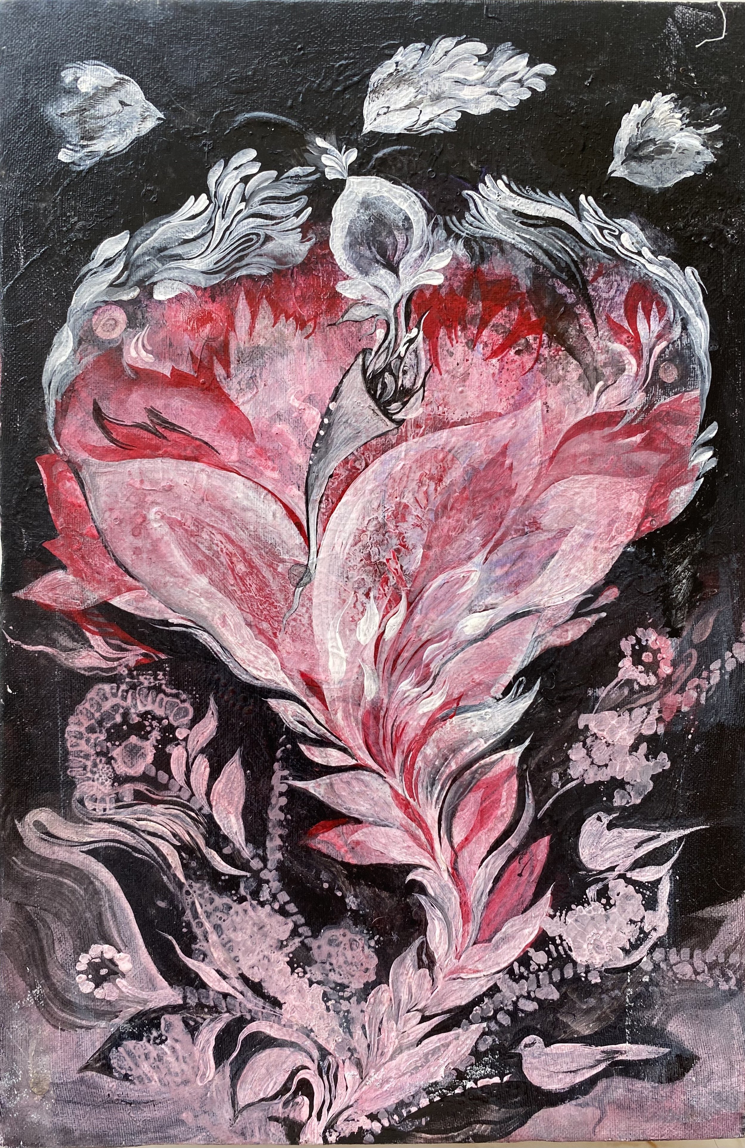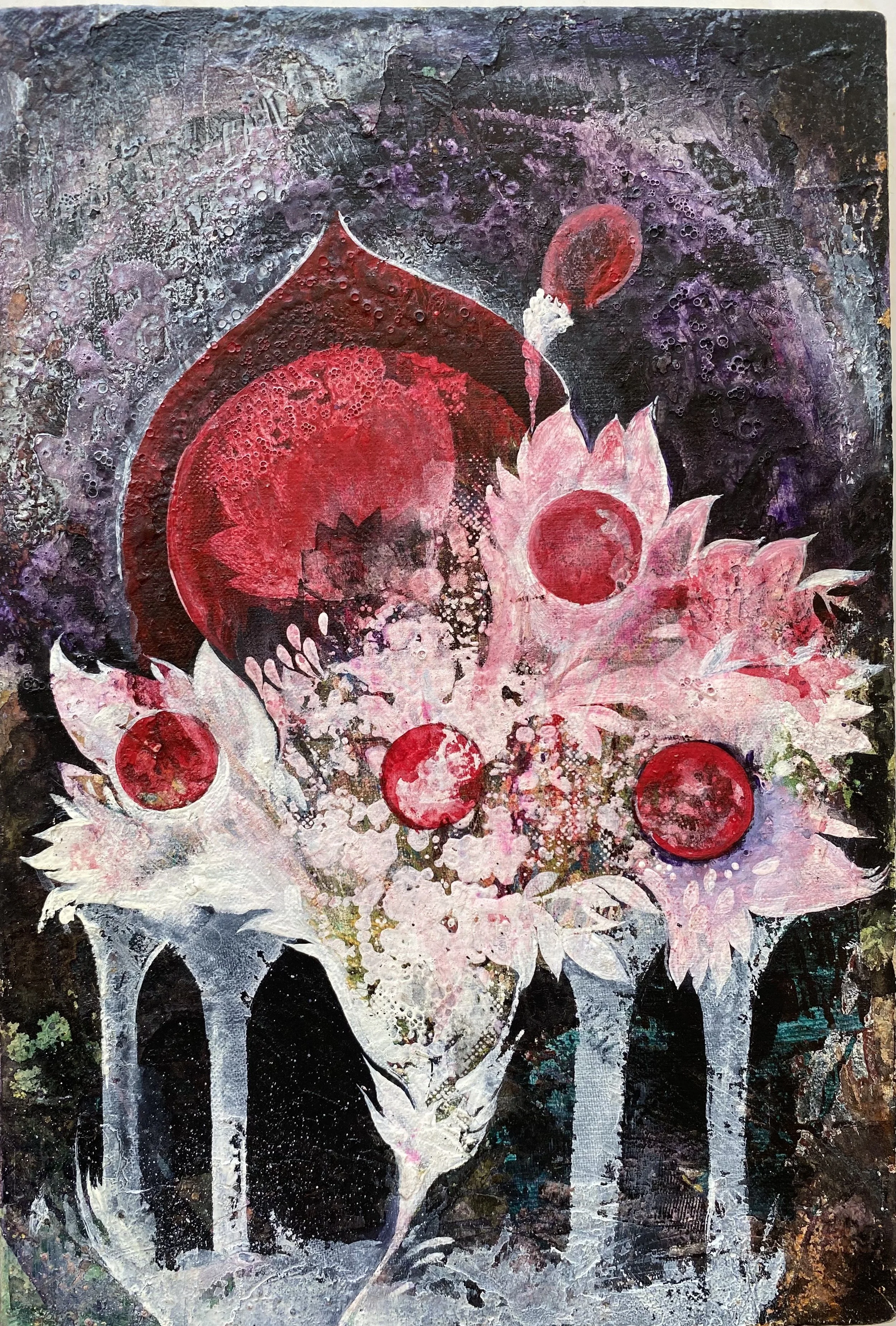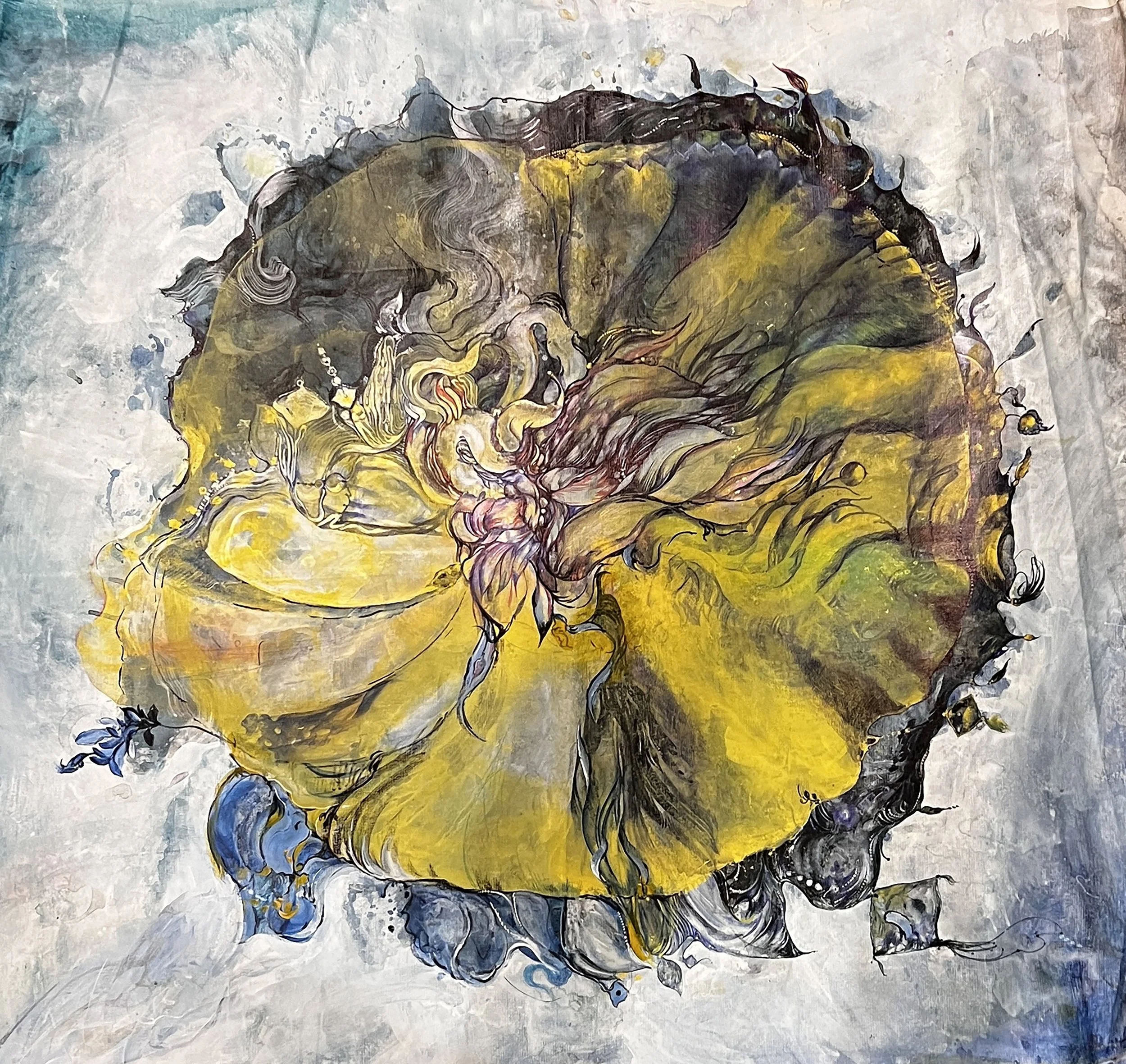 Her paintings draw on ancient motifs, myth, nature, cultural layers and calligraphy, reinterpreted through bold, fresh compositions, which stretch our mind and soul.