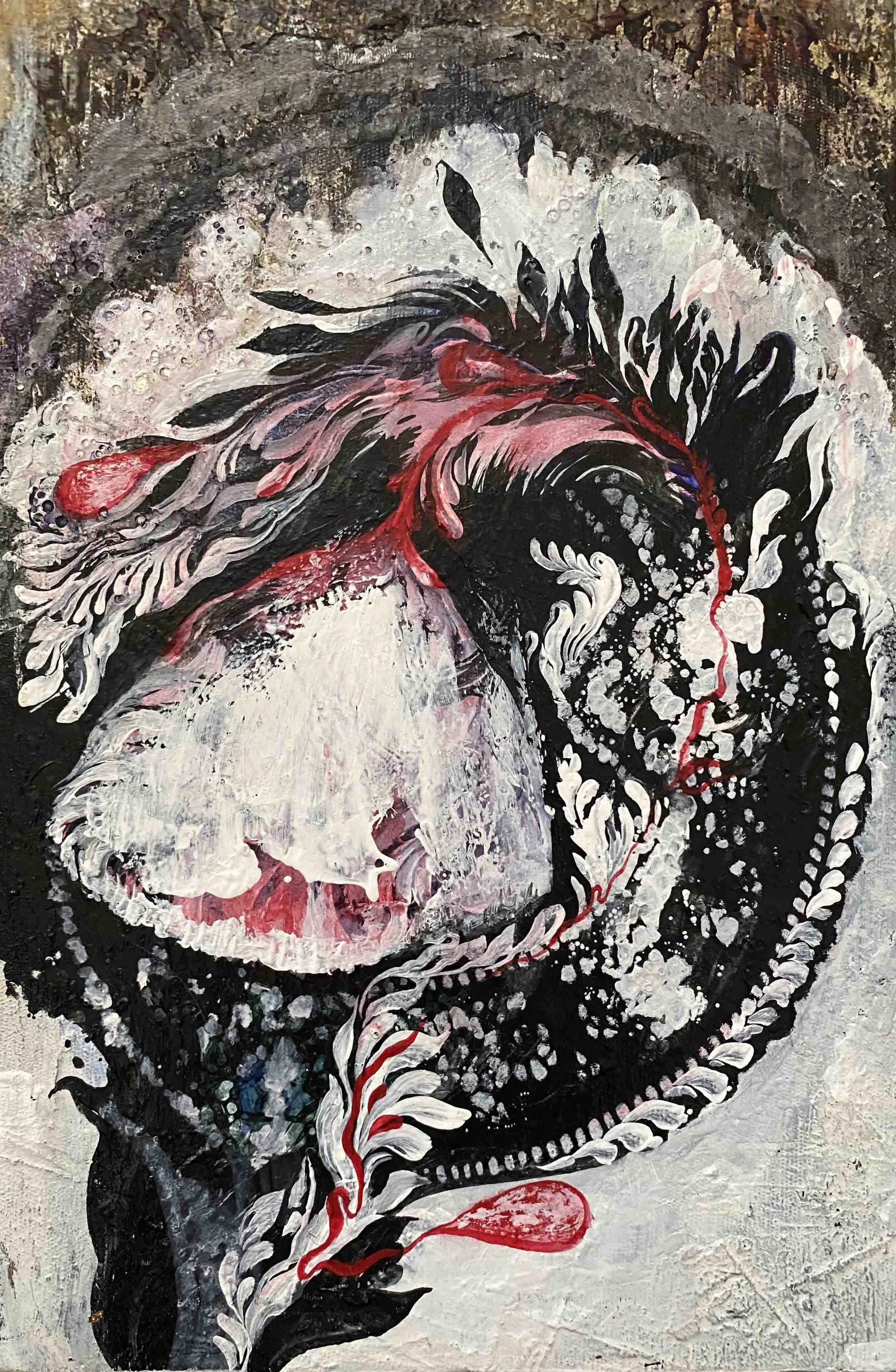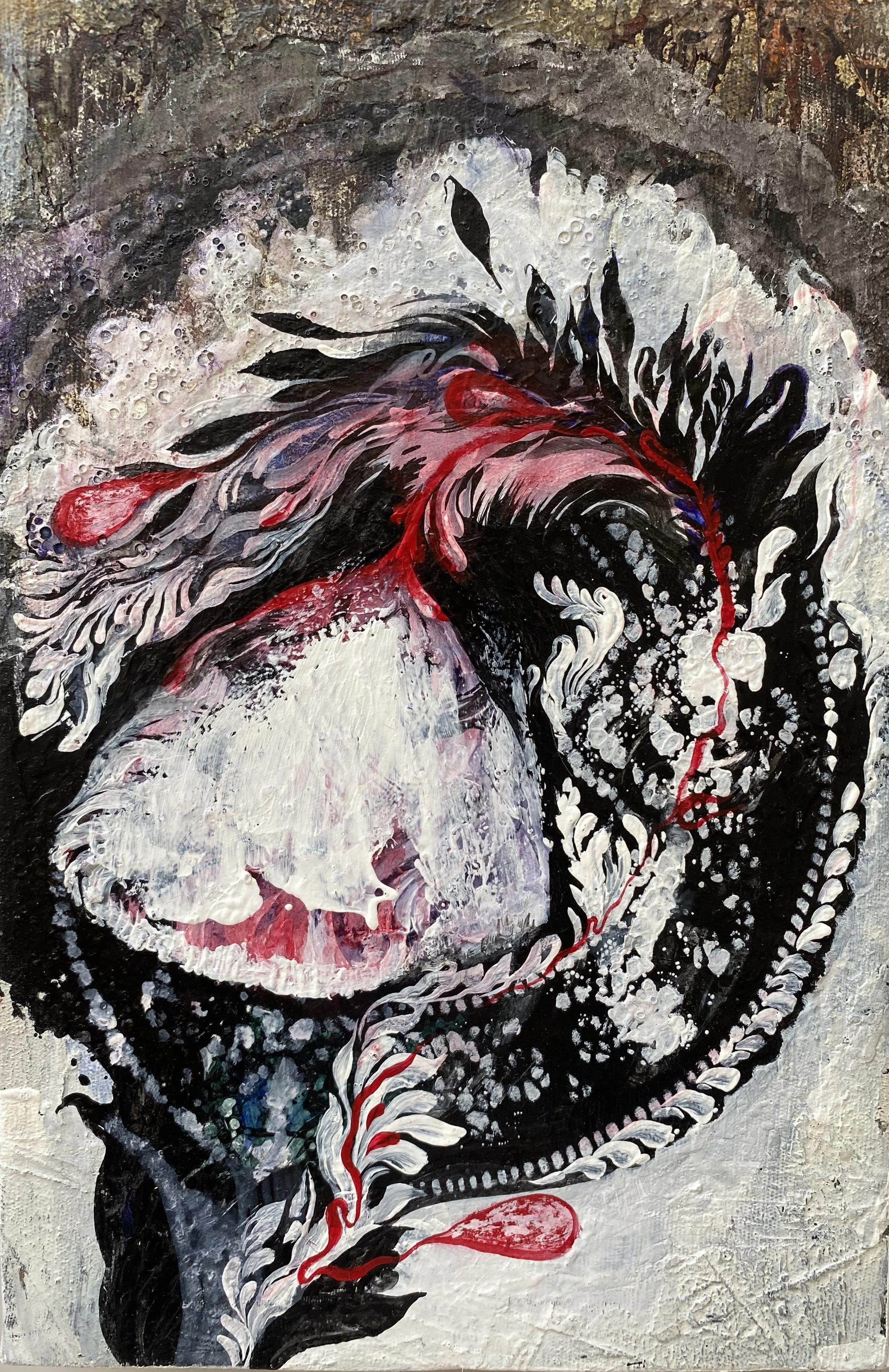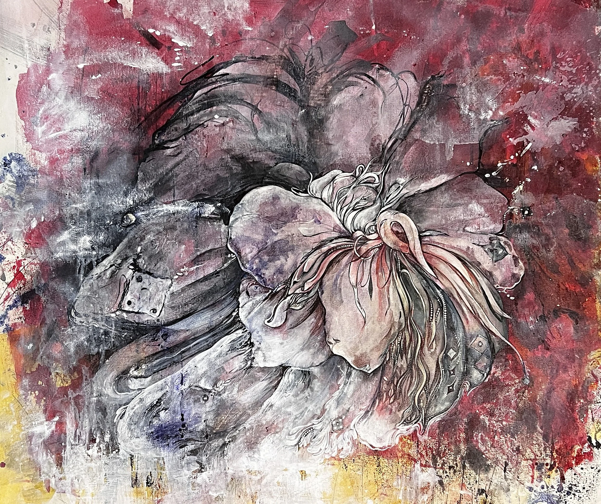 Her process is inner-driven and slow: she layers texture, distorts form, and lets meaning emerge rather than imposing it. That deliberation gives her paintings a rare intensity.